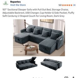 107'' Sectional Sleeper Sofa with Pull Out Bed, Storage Chaise, Adjustable Backrest, USB Charger, Cup Holder & Side Pocket, Fluffy Soft Corduroy U Sha$400Riverside, CA