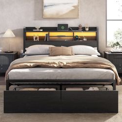 Queen Bed Frame with Wood Headboard and Storage Shelf, Metal Platform Bed Frame Queen Size with Storage Drawers, LED Lights and Charging Station$180Menifee, CA