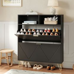 Black Shoe Cabinet with 2 Flip Drawers and Open Shelf,Modern Narrow Shoe Organizer W/ W Pattern for Entryway$100Fontana, CA