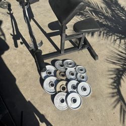 Bench press with Olympic weights 230lbs total plus curl bar and 7ft 45lbs bar$300Moreno Valley, CA