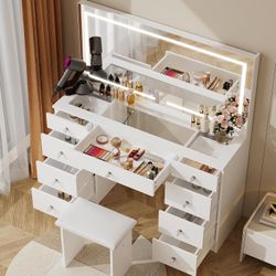 Vanity with Lighted Mirror - 47" Glass Top Makeup Vanity Desk with 9 Drawers and Power Outlet, 3 Color Lighting Modes Adjustable Brightness, Makeup De$220Arrowhed Farm, CA