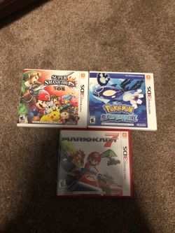 Nintendo 3Ds games! Super Smash, Pokémon Alpha and Mario Kart 7. Been opened but never been use$75Fontana, CA