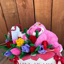 Hugging Bear,with Tulips ๐ท In Wood Basket$40Irwindale, CA