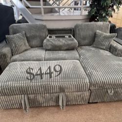 ✅️✅️2 pc Black fur like corduroy fabric sectional sofa with pop up sleep area and storage chaise drop down tray table USB ports✅️$454Lakewood, CA