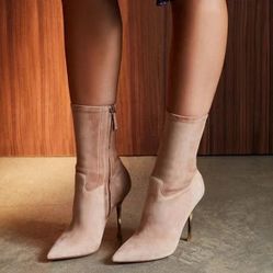Valentino light beige stretch-suede point-toe twist heel mid-calf boot size 37$590Redondo Beach, CA