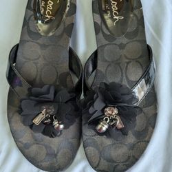 Coach Serenity Sandal Thong Slides patent Leather black Logo flower pearl Sz 5.5$15Sacramento, CA
