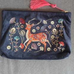 Powder Velvet Embroidered Folk Art Deer Womens Zip Pouch Slate Gift Bag $25El Segundo, CA