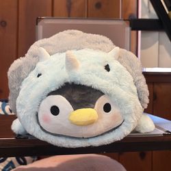 Y665-14” NWT Laying down penguin in a light blue triceratops kigurumi (costume), manufactured by Takashoji$20Arcadia, CA