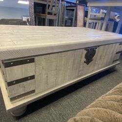 Lift top farmhouse style coffee table with metal keyhole and bracket accents with rivets 2 handles for easy positioning. $599Fontana, CA