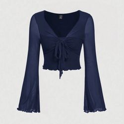 SHEIN: Navy Blue Mesh Tie Front Bell Sleeve Cropped Blouse, Size M$10Westminster, CA