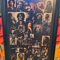 A wall painting in a rustic wooden frame, depicting a skeleton biker and Marilyn Monroe.$65Sacramento, CA