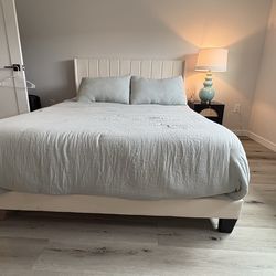 Queen-size double bed in white fabric with upholstered headboard, bed frame with wooden slats. Purchased in April 2024. Available for pickup in the Ro$79Rocklin, CA