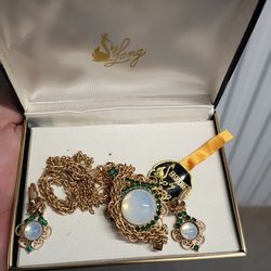 Vintage Gold Tone Moonstone Style Necklace & Earrings Set Green Rhinestones Fil$30Sacramento, CA