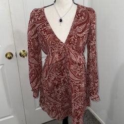 Good Condition | S - M Red paisley mini dress with tie front and bell sleeves$35Corona, CA