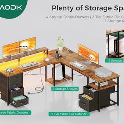 66" L Shaped Computer Desk, 113“ Reversible Home Office Desk with File Cabinet & 4 Fabric Drawers, Two Person Desk with LED Lights & Power O$90Ontario, CA