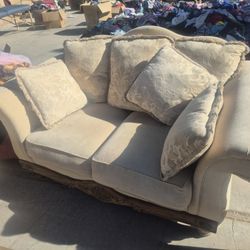 beige upholstered three-cushion sofa featuring decorative throw pillows with a traditional paisley pattern.$80Hesperia, CA