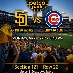 Padres vs Chicago Cubs Tickets (Monday 4/27) – Section 121$70San Diego, CA