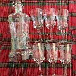 Vintfge1940s Romanian Etched Flowers Leonard Silver Clear Crystal Decanter & 6 Glasses $40El Cajon, CA