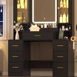 Black Makeup Vanity Desk with Mirror & Lights, Modern Vanity Table with Charging Station, 7 Drawers, Glass Cabinet, Adjustable Shelves, Bedroom Dressi$160San Diego, CA