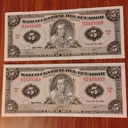 1983 Ecuador Uncirculated Two 5 Sucres Bills Banknotes Currency $20Glendale, CA