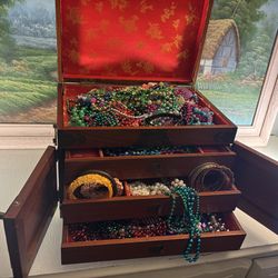 A vintage Chinese jewelry box crafted with rosewood & a bag of jewelry$120Los Angeles, CA