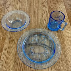 Vintage Indiana Glass “See-Saw Margery Daw” Children’s Dish Set – Plate, Bowl & Blue Mug $36Arroyo Grande, CA