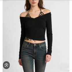 🎀SHEIN women's BLOUSE featuring a V-neck, long lantern sleeves with elastic cuffs, and a decorative leopard print scarf detail-$20🎀$20San Jose, CA