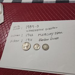 3 Old Coins 1 1989 Quarter 1 1942 Mercury Dime 11016 Barber Dime$50San Jose, CA