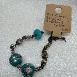 Bracelet Art Glass Crystal Leather & Silver$10Visalia, CA