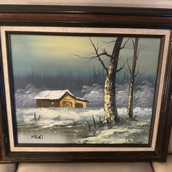 Vintage signed oil painting winter snow cabin landscape framed ready hang 26x22$60Fresno, CA