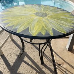 Shabby wood table / iron legs - 42 inches wide/. 30 inches high- no chairs with round Top glass for table$200Fresno, CA