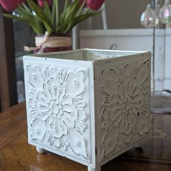 French Inspired White Distressed Metal Cachepot~Embossed Floral Motifs 4"x4"$12Placentia, CA