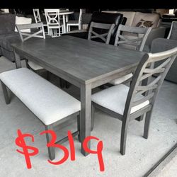 ✅️✅️(6 pc white & grey finish wood dining table set grey padded seat chairs and bench✅️✅️✅️$298Pico Rivera, CA