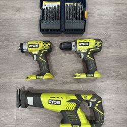Ryobi - set of 2 drills, 1/2-inch Cordless Drill/Driver, impact driver, 29 bit and Reciprocating Saw$100Baldwin Hills, CA