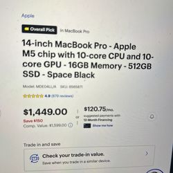 14 inch MacBook Pro, Apple L5 chip with core CPU and 10 core CPU 16 GB memory$1,449Los Angeles, CA