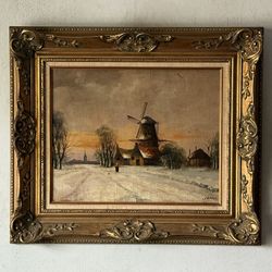 OLD DUTCH ANTIQUE SNOWY WINTER LANDSCAPE OIL PAINTING VINTAGE SNOW WINDMILL 1930$475Pasadena, CA
