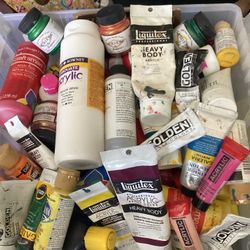 Huge Box Of Acrylic Paints Including Liquitex, Golden, Lumiere, DecoArt + Brushes$60Highland Park, CA