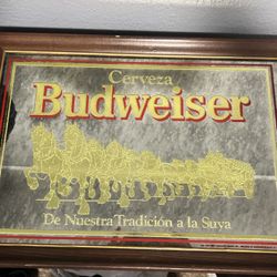 Vintage 1986 Cerveza Budweiser Spanish Bar Mirror with Clydesdale$30Rancho Suey, CA