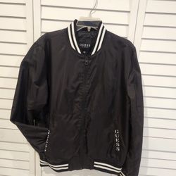 GUESS Y2K Black Satin Bomber Jacket Striped Ribbed Collar Cuff Waist Logo Mens M$45Westchester, CA