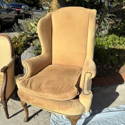 Antique Queen Anne style wingback armchair upholstered in mustard yellow velvet fabric. $20La Costa, CA