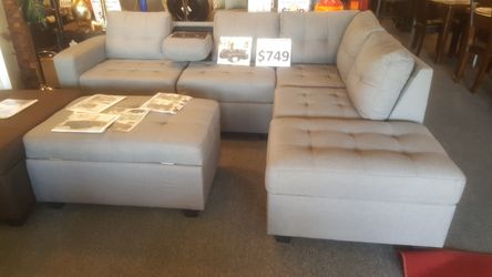 Brand new chocolate or light grey woven linen reversible sectional with drop-down tray, storage ottoman and storage chaise$599San Diego, CA