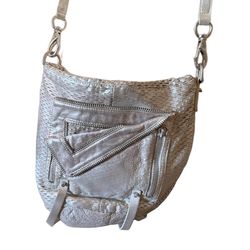 she and lo metallic distressed silver sparkly genuine leather perforated crossbody zipper bag large hobo style All wear shown No holes Rich leath$25San Diego, CA