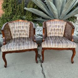 Pair Vintage French Cane Barrel Back Chairs Striped Fabric Upholstery Two Set Hollywood Regency$200San Diego, CA