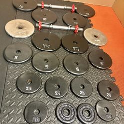 Set of Cast Iron Adjestables Dumbbells With Weight Plates: 10s, 7.5s, 5s, 2.5s and 1.25 pounders. Brute W: 115 #$135Los Angeles, CA