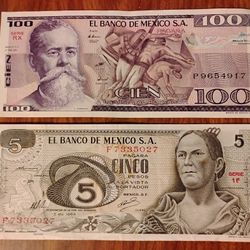 1969 Mexican Mexico 5 Pesos And 1981 Mexico 100 Pesos Bills Banknotes Currency $15Glendale, CA