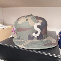 SUPREME X SWAROVSKI S LOGO NEW ERA FITTED HAT in Woodland Camo 7 5/8$385Manteca, CA