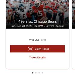 2 Tickets – 49ers vs Bears (Red Zone – Section 111, Row 9)$789San Jose, CA
