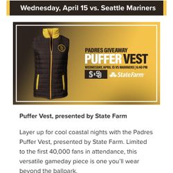 Padres Single Ticket 04/15/2026 Puffer Vest Giveaway$130San Marcos, CA