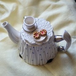 Figural Coffee Table Ceramic Teapot With Coffee Cup and Saucer, English Cardew Plate With 2 Doughnuts, On Lace $35San Clemente, CA