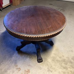 Vintage Solid Wood (I think it’s mahogany) Round Breakfast Table with Braided Edging, Claw Feet, Glass Cover and it Rolls$350Hemet, CA